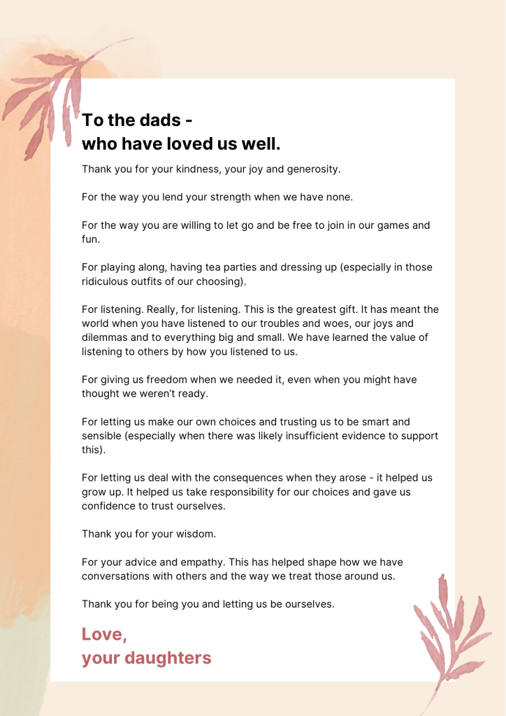 A few years ago I called my dad out on his card etiquette. He would simply write “dear Steph” and “love Dad,” in every birthday and Christmas card. The end. As a person whose love language is words of affirmation, this was deeply unsatisfying for me. I made a sarcastic quip, cos that’s what you do, suggesting “what’s the point? Why bother with the card if it isn’t going to say anything?” I was sure my frugal father would appreciate saving between $2-8 by skipping the card on each occasion. However, he surprised me. The next card I opened was specifically chosen for the message and in addition he had taken the time to carefully craft a meaningful message of love and appreciation for me. This is my most treasured gift, the ultimate card I have received. Not just because the message was kind and thoughtful. But my very grown up father listened to the curt quip of his adult daughter and instead of dismissing it, he listened. He listened, reflected and actioned something he knew was meaningful to me – even though it was of little importance to him. This is my dad.